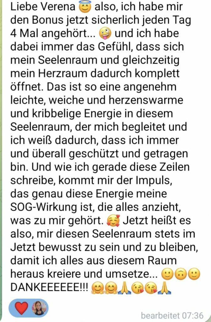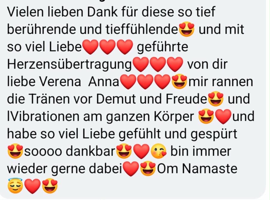 Liebe Verena! Vielen Herzlichen Dank für deine Arbeit, ich fühlte mich in deiner Nähe sehr wohl und gut aufgehoben, man spürte die Harmonie den Frieden und die Freude, du machst deine Arbeit sehr gut man merkt das du es mit voller Liebe und innerer Ruhe dabei bist, nach der Arbeit fühlte ich mich schon viel besser. Vielen dank, man kann dich nur weiter empfehlen . Karin