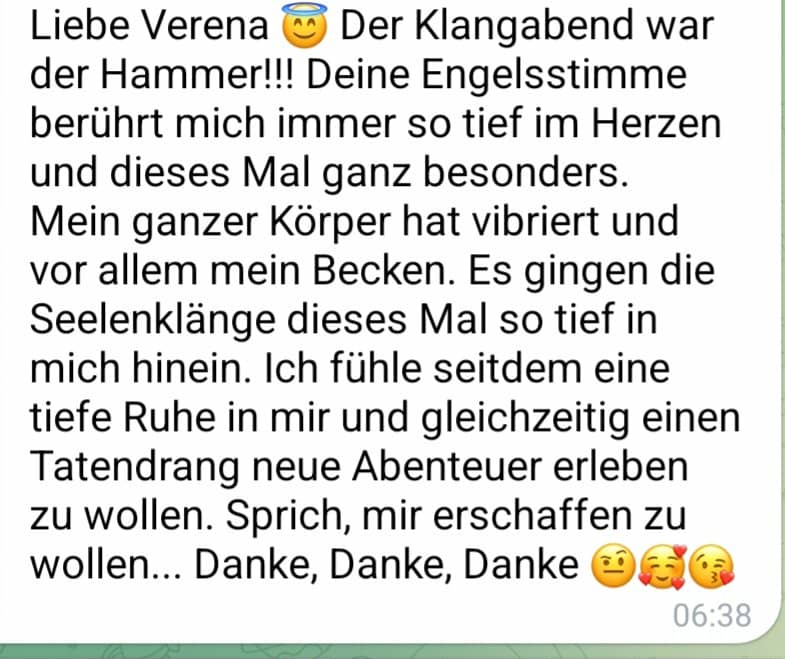 Liebe Verena Anna Skargeth, was war das denn bitte. Deine Frequenzsprache ist ja der Hammer, ich hatte das Gefühl ich bin ausserhalb von Raum und Zeit und dennoch schwamm ich vorgeburtlich in meinem Fruchtwasser. Ich erinnerte mich an Geräusche, Stimmen, Herzschläge, Ulltraschallfiepen … Dein Gesang hat soviel altes Wissen in mir aktiviert, soviel Weisheiten, so alte Welten, die ich schon bereist hatte.